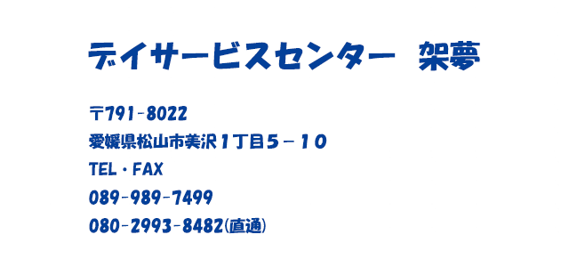 デイサービスセンター 架夢では、ご利用者様の自立支援や安心できる場所として、皆様に親しまれる事業所を目指しております。